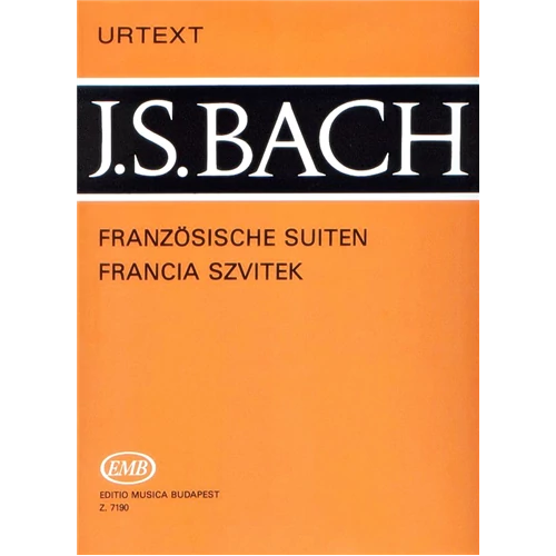 J.S.Bach: Francia szvitek zongorára SUITE (d-moll) Allemande - Courante - Sarabande - Menuet I.- Menuet II. - Gigue, SUITE II. (c-moll) Allemande - Courante - Sarabande - Air - Menuet - Gigue, SUITE III. (h-moll) Allemande - Courante - Sarabande - Menuet - Gavotte (Anglaise) - Gigue, SUITE IV. (Es-dur) Allemande - Courante - Sarabande - Gavotte - Menuet - Air - Gigue, SUITE V. (G-dur) Allemande - Courante - Sarabande - Gavotte - Bourrée - Loure - Gigue, SUITE VI. (E-dur) Allemande - Courante - Sarabande - Gavotte - Polonaise - Bourrée - Menuet - Gigue. Utószó, Díszítések. |