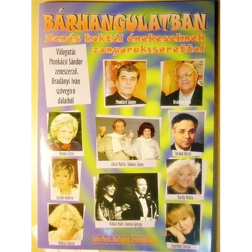 Bárhangulatban. Zenés koktél énekeseknek zongorakísérettel. Válogatás Munkácsi Sándor zeneszerző, Bradányi Iván szövegíró dalaiból. 1./ Meddig kell, várjalak még?!, 2./ Mit adhat még az élet?, 3./ Ez az út nem visz feléd, 4./ Neked épp úgy kell a szerelem, 5./ Szívem a Tiéd, 6./ Ez az első éjszakám nélküled, 7./ Ő vagy én?, 8./ Köszönök mindent, 9./ Akinek a szíve nem fájt még, 10./ A kéklő tengeren, 11./ A véletlenen múlott, 12./ Ezt az éjszakát még veled..., 13./ Vasárnapi apuka, 14./ Mondd,hogy képzeled ezt?, 15./ Soha nem adom fel, 16./ Félbe tépted az álmot, 17./ Keresem a lényeget, 18./ Micsoda érzés, 19./ Egy szó elég, 20./ Nincs vége még, 21./ Senki másért nem adnálak, 22./ Hirtelen azon az estén. |