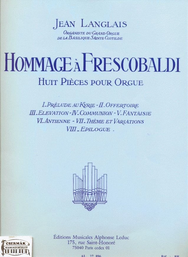 Jean Langlais: Hommage á Frescobaldi Huit Piéces pour Orgue. I./ Prélude au Kyrie, II./ Offertoire, III./ Elevation, IV./ Communion, V./ Fantaisie, VI./ Antienne, VII./ Théme et Variations, VIII./ Epilogue. |