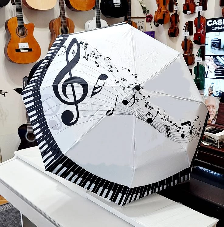 Esernyő, automata, fehér alapon fekete violinkulcs, és hangjegyek mintával Nyitás: Automatikus Esernyőszövet anyaga: Pongee (210T), belső fele fekete színű. Esernyő fogantyú anyaga: Műanyag Esernyő borda anyaga: Vas Bordák száma: 8 Borda Ernyő nyél anyaga: Vas Zenei ajándéktárgy |