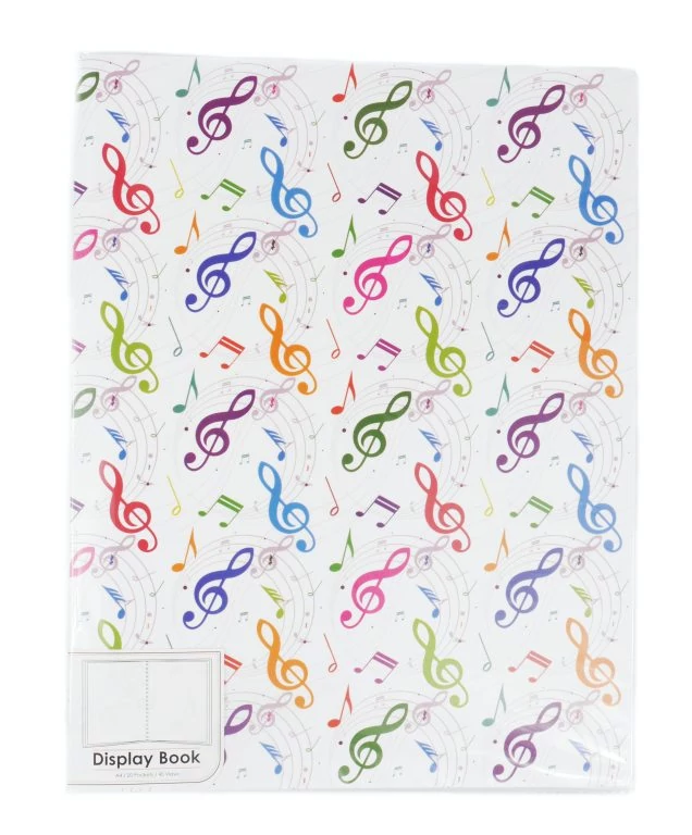 Fehér mappa, 20 db lefűzhető irattartóval, színes violinkulcs mintával A/4 méretű Zenei ajándéktárgy. |