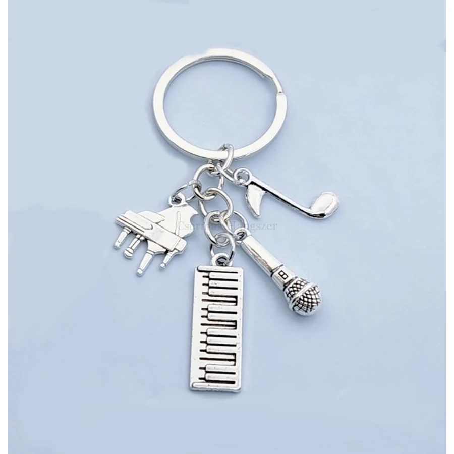 Kulcstartó, ezüst színű, zongora,hangjegy,mikrofon