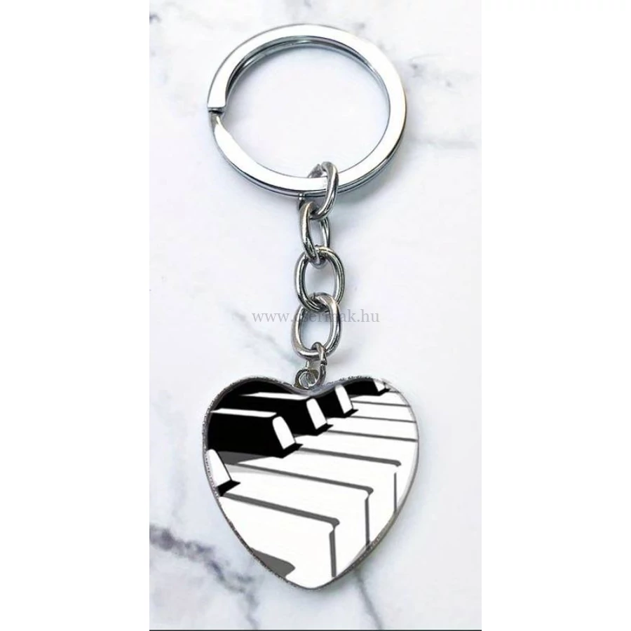 Kulcstartó, szív forma, fekete és fehér billenytű mintával Hossza: 8 x 2,8 cm Zenei ajándéktárgy. |