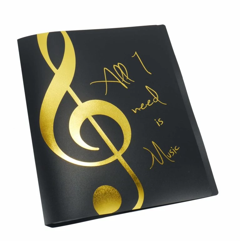 Mappa, fekete, 20 db lefűzhető irattartóval, arany színű "All I need is Music" felirattal és violinkulccsal