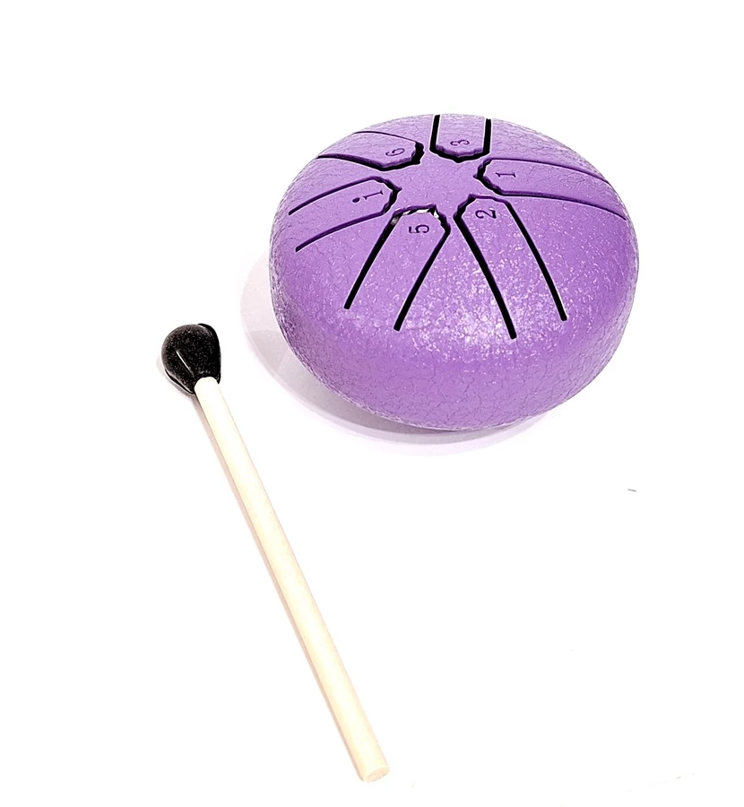 6-hangú mini acél nyelv dob, ütővel 3 hüvelykes, hordozható szénacél kézidob, ütővel éteri dob meditációhoz és jógához, lila színben 7,5 cm X 4,5 cm |