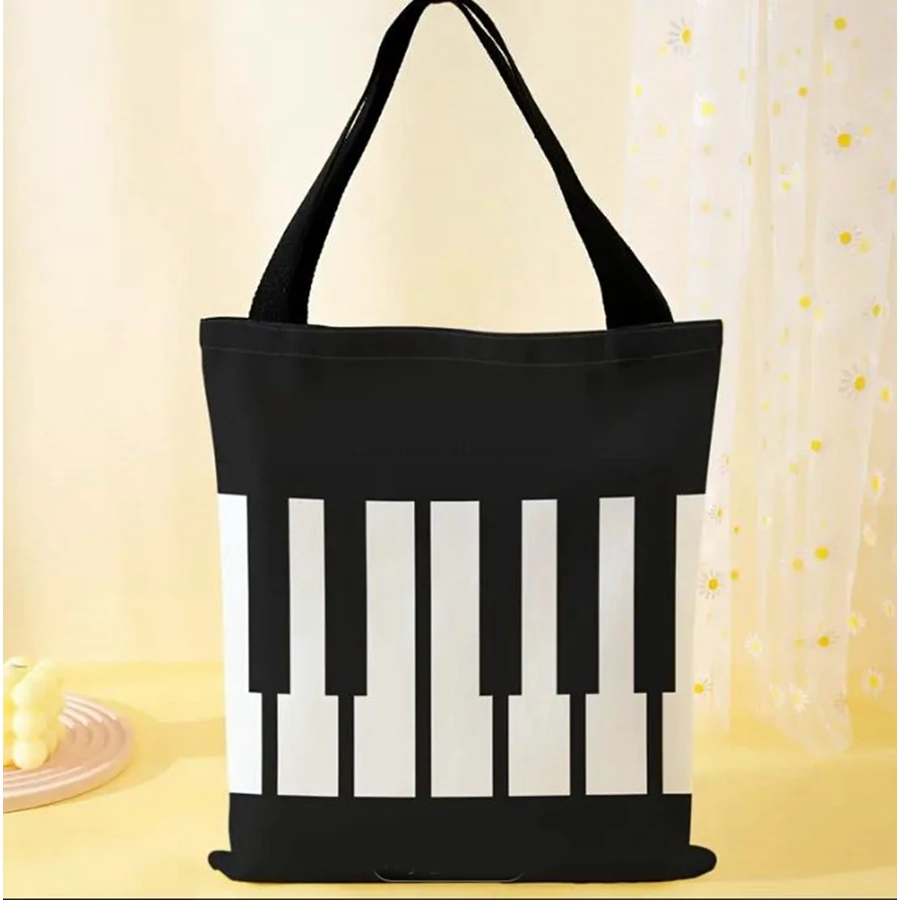 | Táska, fekete, fehér billentyűzet mintával, fix pánttal Méret: 44 cm X 34 cm, fül: 21 cm Zenei ajándéktárgy Anyaga: vászon, bélés nélküli Kezelési útmutató: Kézi mosás | |