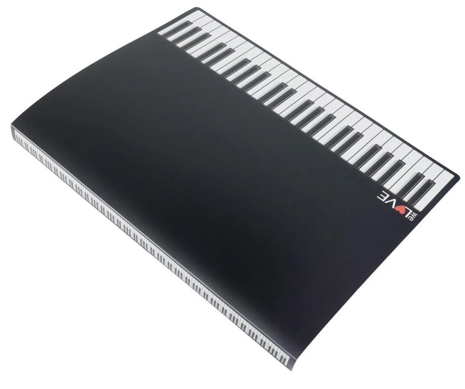 Fekete mappa 20 db lefűzhető irattartóval, zongorabillentyű mintával. A/4 méretű. Zenei ajándéktárgy. |