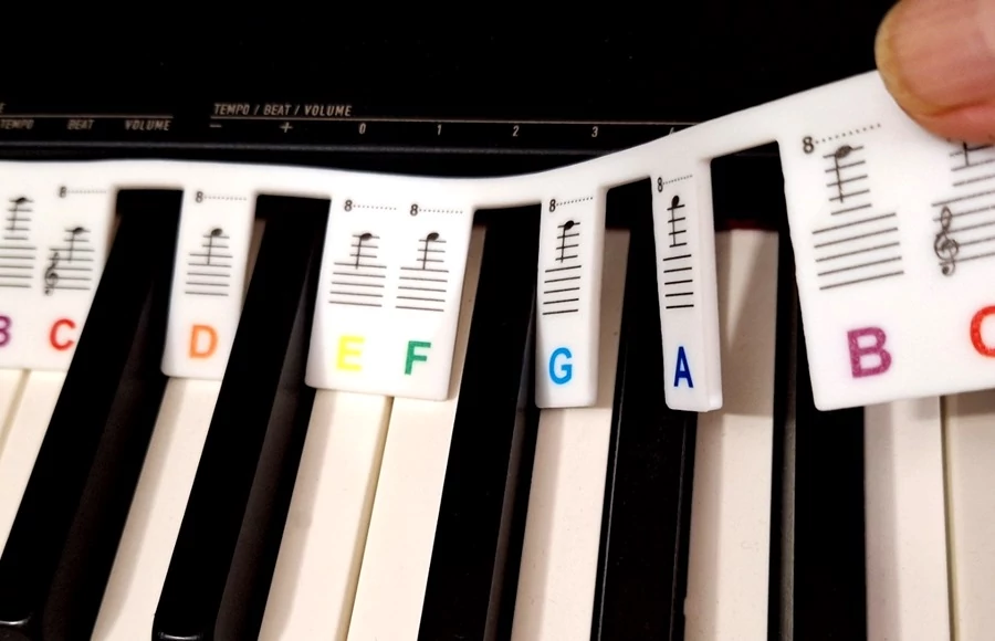 | Zongorabillentyűre helyezhető, színes, levehető, útmutató cimke Többször használható zongorabillentyű címke kezdőknek – 88 billentyűs teljes méretű, szilikonból, útmutató a dobozban. | |